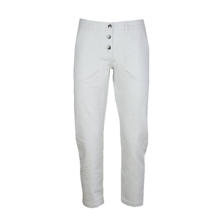 With a button fly you'll be ultra modern in this slim leg cropped pant. The patch pocket elongates the thigh area to add length to a fuller thigh.